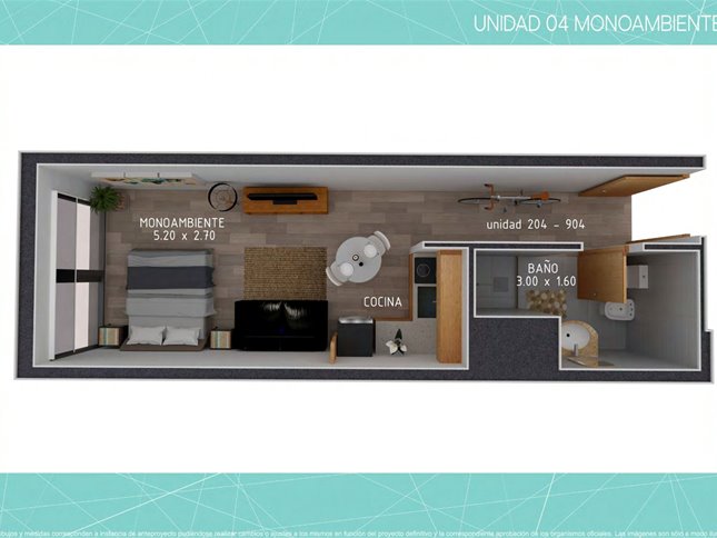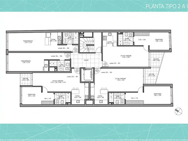 Apartamentos monoambientes y de 1 dormitorio distribuidos en 10 pisos, con 50 apartamentos en total.