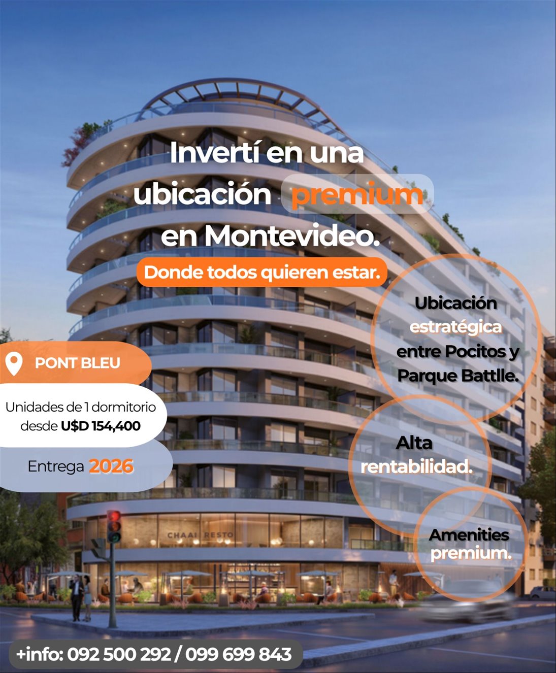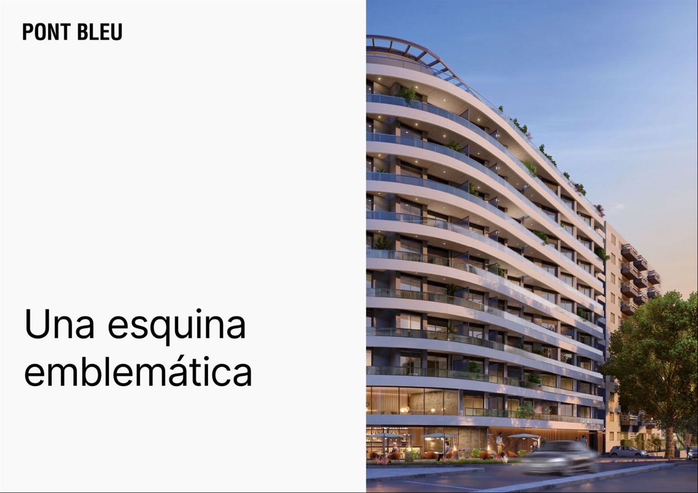 Ubicado en una esquina emblemática, Pont Bleu se encuentra en el límite entre dos de los barrios más afamados de Montevideo, en el corazón de una zona provista de una gran variedad de comercios y servicios, con amplia oferta de universidades, movida gastronómica, centros de salud, y locomoción estratégica.