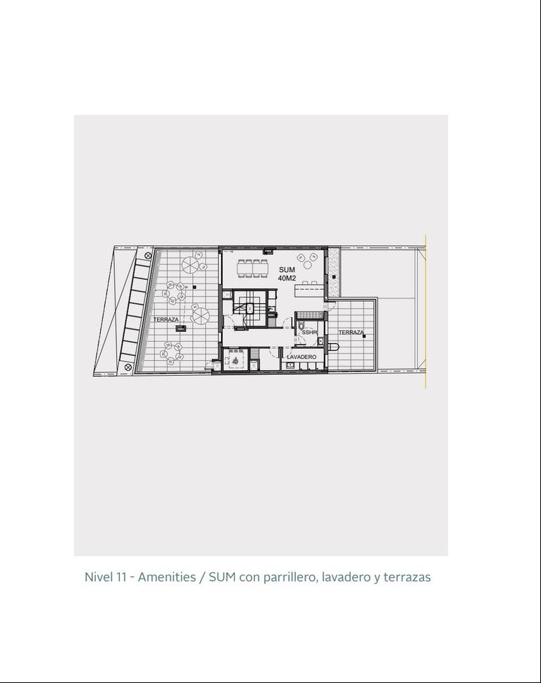 • En el nivel de azotea, un salón cerrado común, equipado con mobiliario, parrillero, kitchenette, una isla alta, y una amplia terraza al frente del edificio.